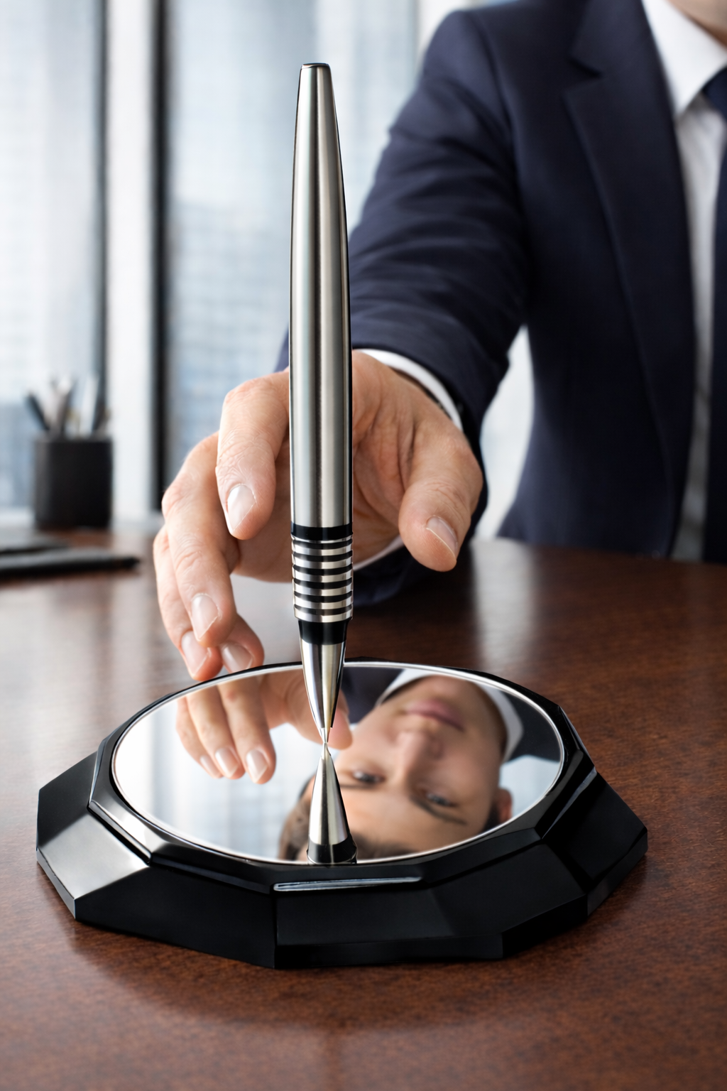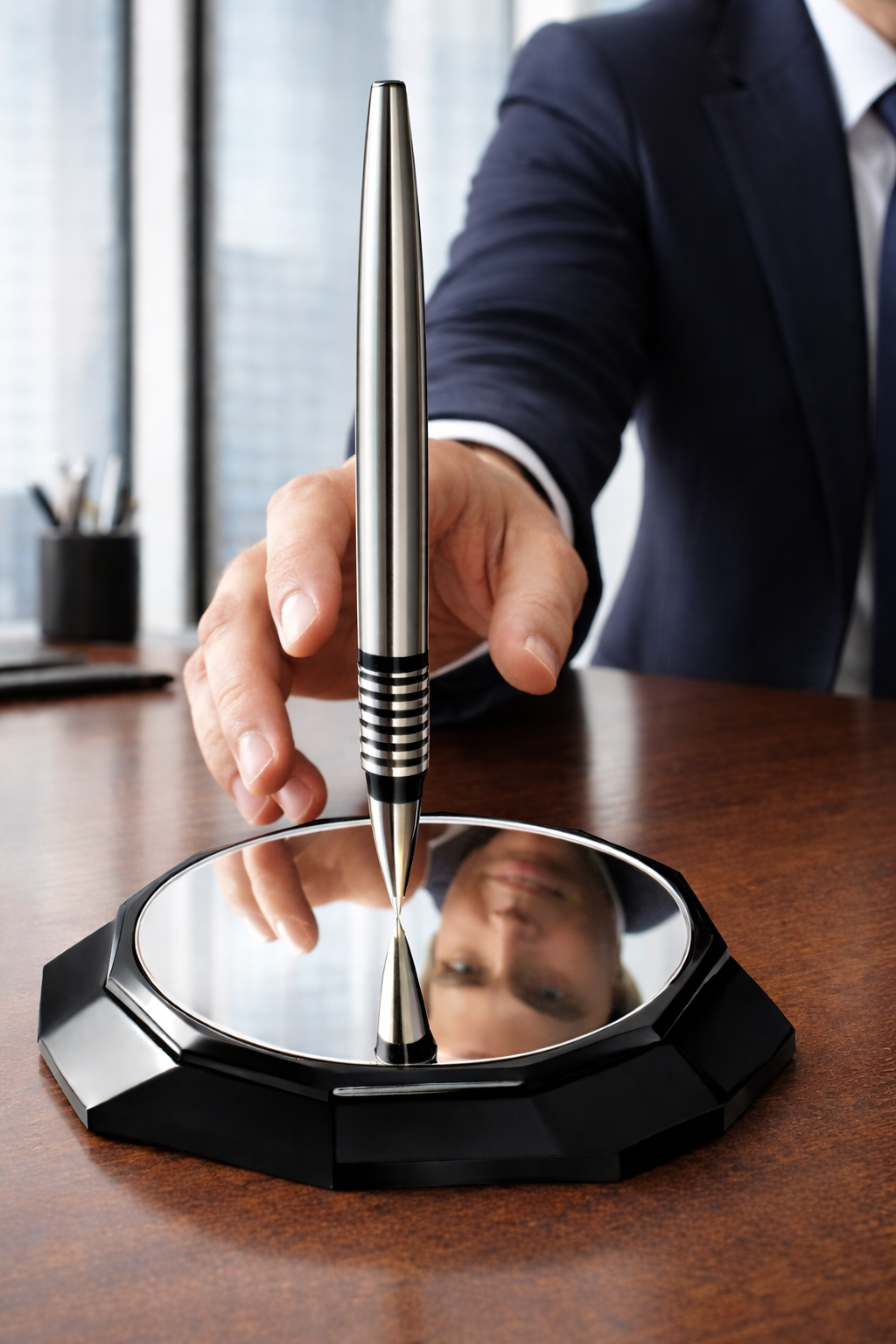 Unlike ordinary pens, Apollo is precision-weighted to balance vertically on its own tip. Advanced patent-pending technology. No power. Just physics — and craftsmanship — creating a mesmerizing, conversation-starting centerpiece.